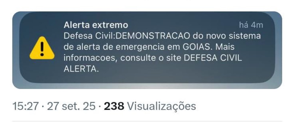 Neste sábado (27), moradores de Goiânia, Itumbiara, Formosa, Cidade de Goiás e municípios vizinhos receberam um alerta de teste do sistema Defesa Civil Alerta, desenvolvido pelo Governo Federal em parceria com a Anatel e o Ministério das Comunicações. O objetivo da ação foi testar o funcionamento da ferramenta, que será oficialmente implementada em todo o estado a partir de 1º de outubro.