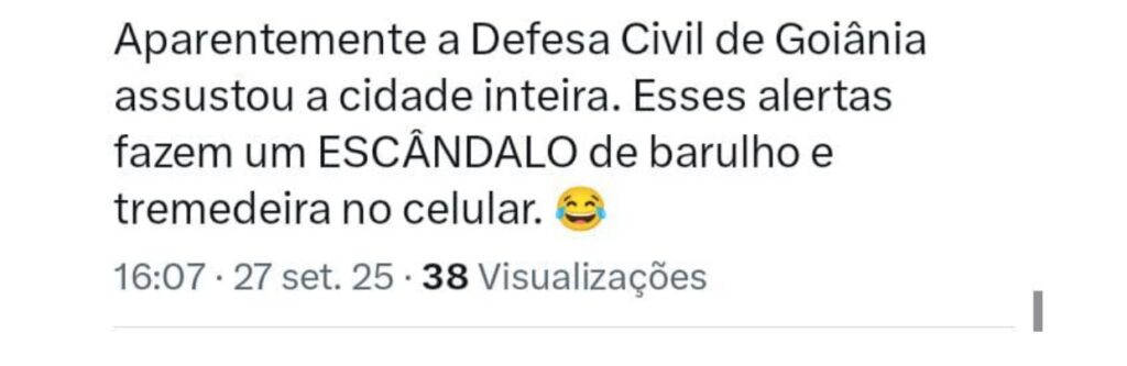 ” Aparentemente a Defesa Civil de Goiânia assustou a cidade inteira. Esses alertas fazem um ESCÂNDALO de barulho e tremedeira no celular”. 😂 comentou outro internauta.