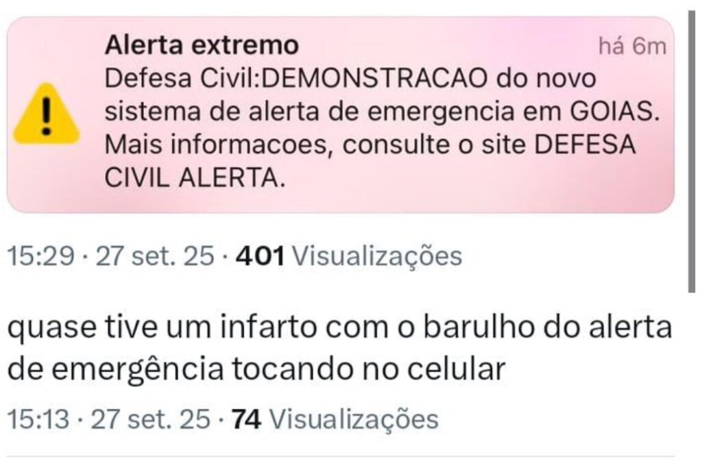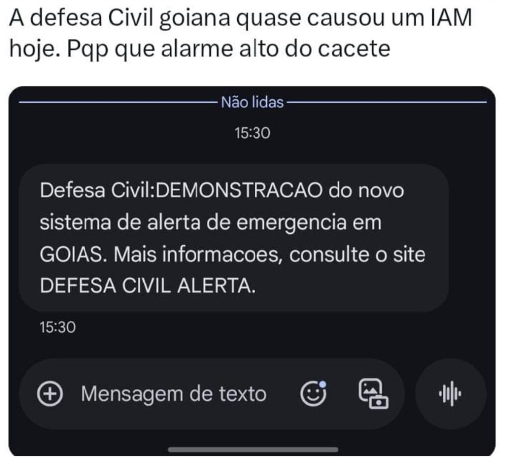 “Me senti em Israel, recebendo alerta de mísseis do Irã. Mas é só a Defesa Civil de Goiás testando o coração do goiano mesmo”, escreveu um usuário no X.