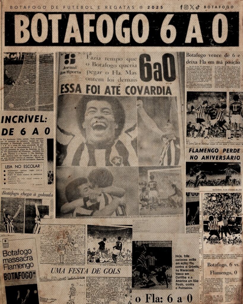 No dia em que o Flamengo completa 130 anos de existência, o Botafogo fez uma provocação nas redes lembrando da icônica goleada por 6 a 0 sobre o rival, há 77 anos. O post traz um resumo da partida e uma arte com imagens dos jornais da época com manchetes como: “Foi covardia”, “Uma festa de gols”. – Seis gols de presente.