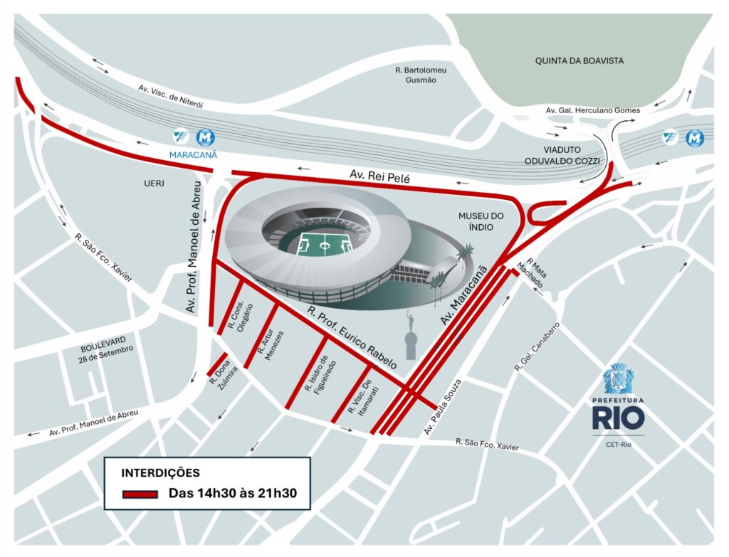 A CET-Rio realizará operação de trânsito neste domingo, 21/09, para o jogo entre Flamengo e Vasco Campeonato Brasileiro, que acontecerá às 17h30, no estádio do Maracanã. A partir das 14h30, haverá interdições ao trânsito de veículos na região. E, além dos locais regulamentados com proibição de estacionamento, outras vias estarão restritas ao estacionamento a partir das 10h da data que ocorre a partida de futebol.