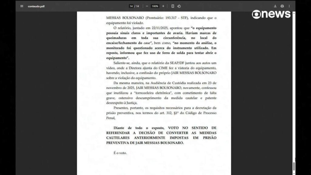 O ministro Alexandre de Moraes, do Supremo Tribunal Federal (STF), afirmou em seu voto nesta segunda-feira (24) que o ex-presidente Jair Bolsonaro violou “dolosa e conscientemente” a tornozeleira eletrônica. “A continuidade no desrespeito às medidas cautelares, entretanto, não cessou. Pelo contrário, ampliou-se na última sexta-feira, dia 21/11, quando Jair Messias Bolsonaro violou dolosa e conscientemente o equipamento de monitoramento eletrônico, conforme comprova o relatório da SEAP/DF ‘acerca da monitoração eletrônica’, escreveu Moraes no voto.