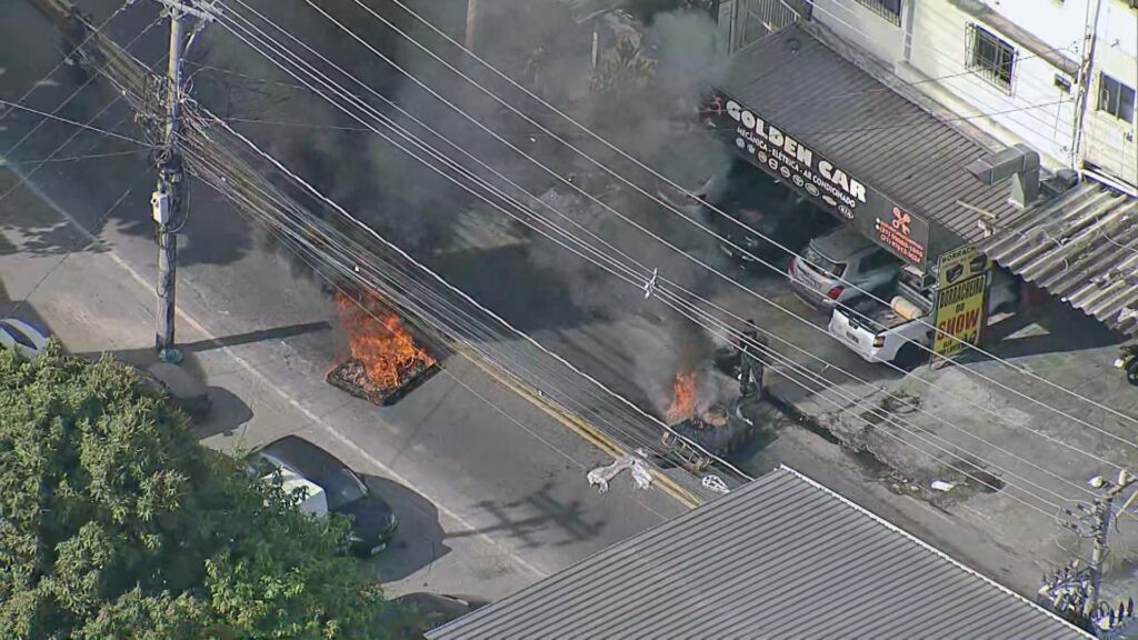 Na Avenida Tenente-Coronel Muniz de Aragão, que liga a Freguesia à Cidade de Deus, barricadas em chamas interditavam ambos os sentidos.