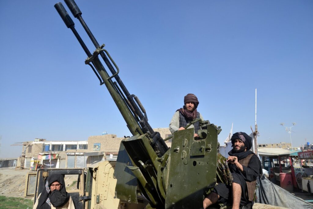 Armed Taliban security personnel operating an anti-aircraft gun watch the sky for Pakistani airstrikes during ongoing clashes between Taliban security personnel and Pakistani border forces in the Spin Boldak district of Kandahar Province on October 15,2025. Dozens were killed in a fresh round of border skirmishes on October 15 between Pakistan and Afghanistan, as both sides blamed each other for targeting civilians in clashes that entered their second week. (Photo by Sanaullah SEIAM / AFP)
