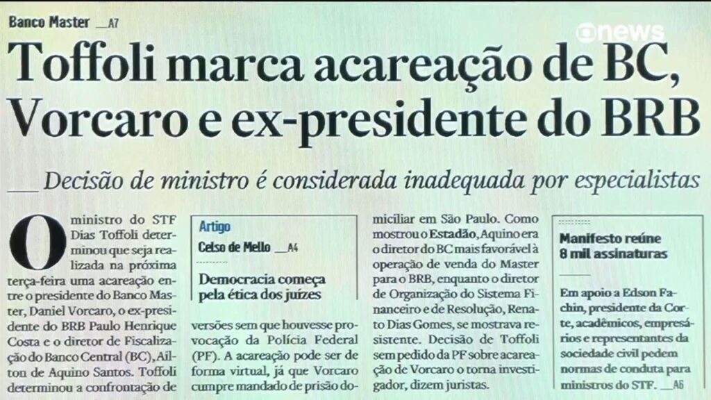 O ministro Dias Toffoli, do STF, negou pedido da PGR para suspender uma acareação no caso do Banco Master. A PGR alegou que não havia premissas para a acareação, já que os intimados ainda não foram ouvidos individualmente. Serão ouvidos o dono do banco, Daniel Vorcaro, o ex-presidente do BRB Paulo Henrique Costa e um diretor do Banco Central.
