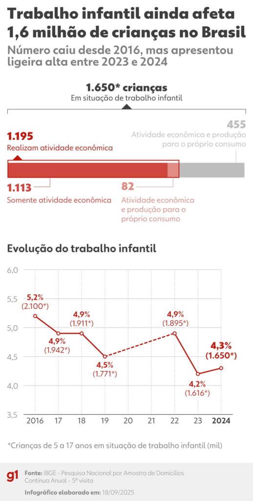 Após uma queda histórica, o trabalho infantil voltou a crescer em 2024, registrando alta de 2,1%.
